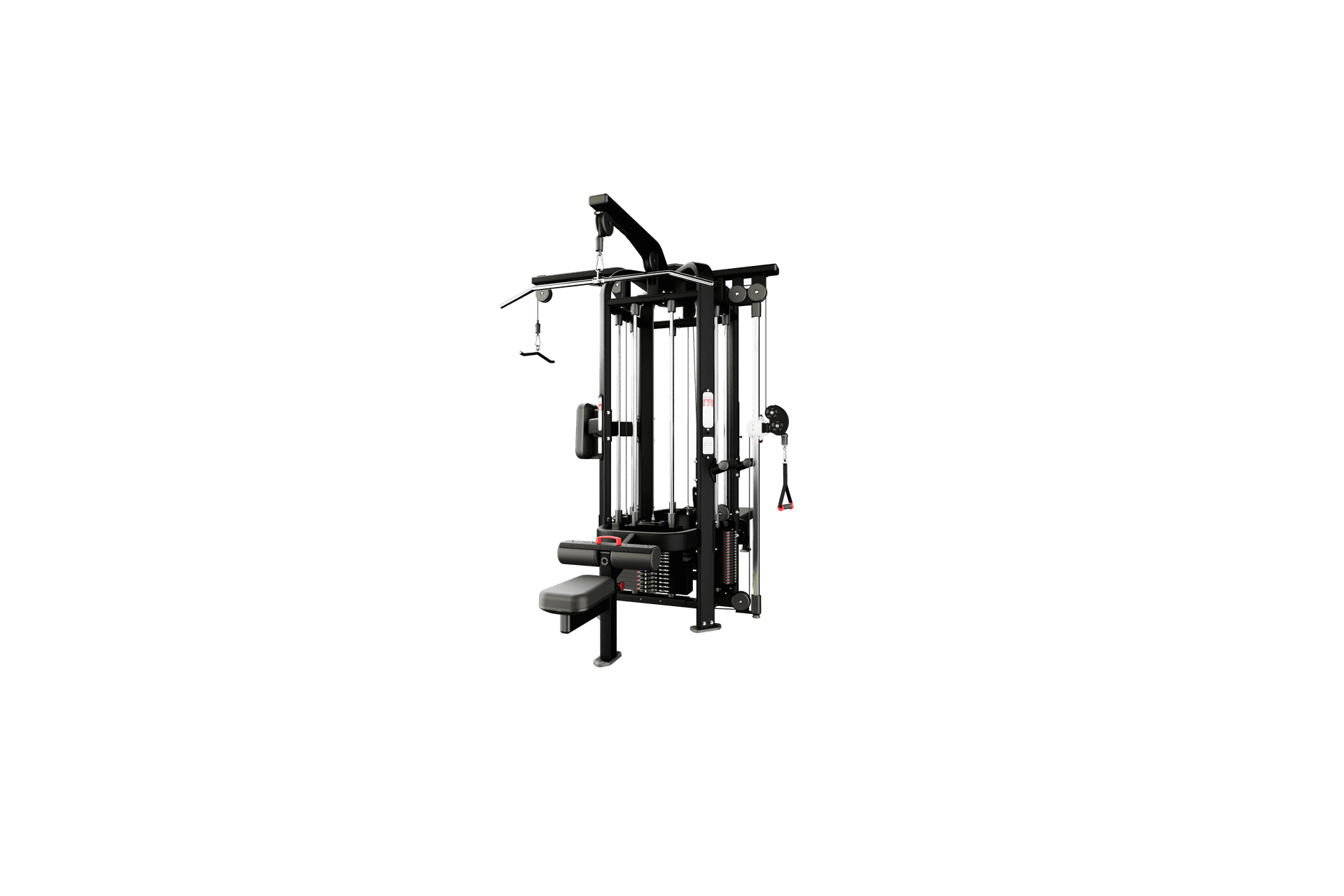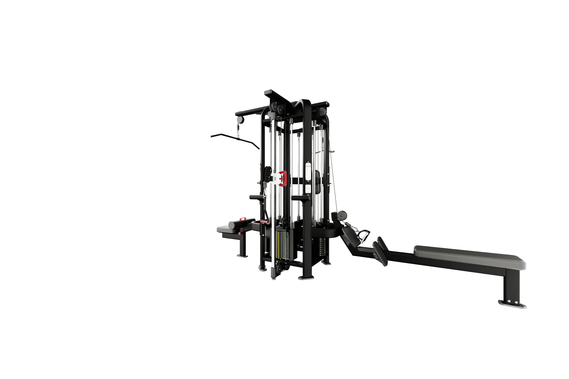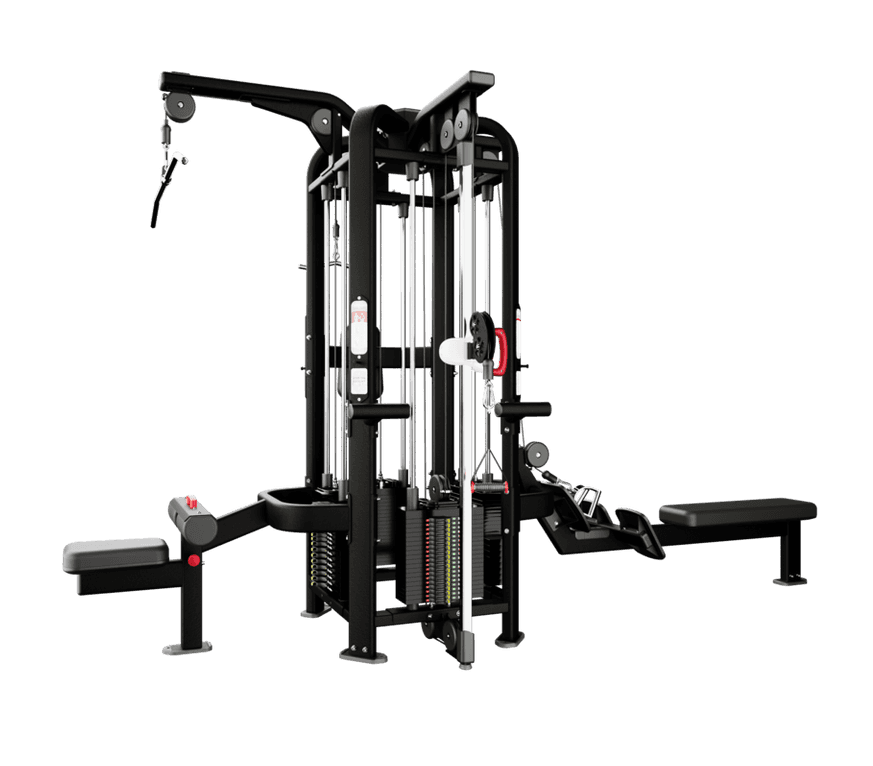 Commercial 4-station multi-gym with adjustable cable crossover, swivelling pulleys, and Lock N Load® system. Full-body training in a compact footprint.