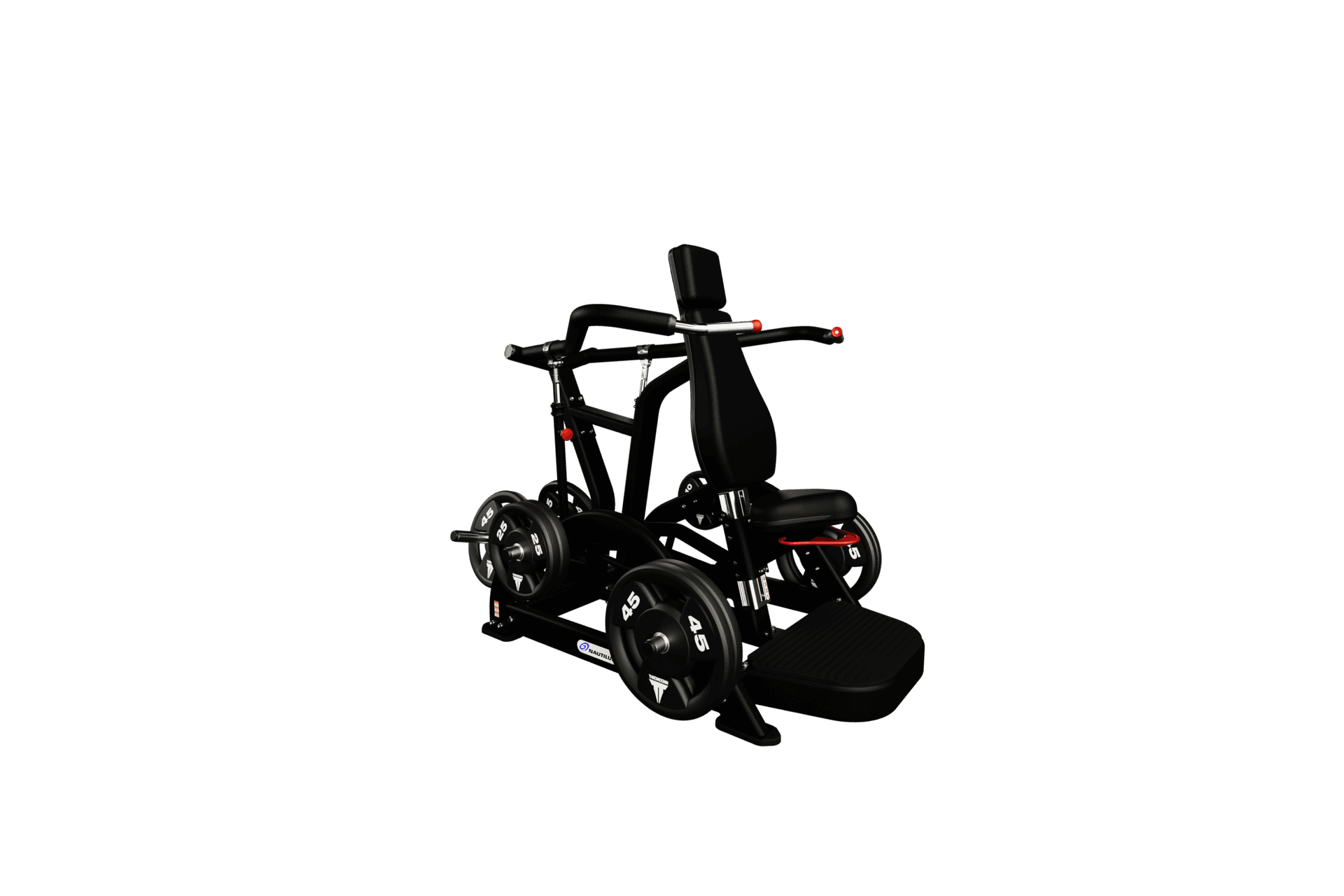 Commercial plate-loaded shoulder press with independent arms, converging motion, and gas-assisted seat. Engineered for power, comfort, and precision.